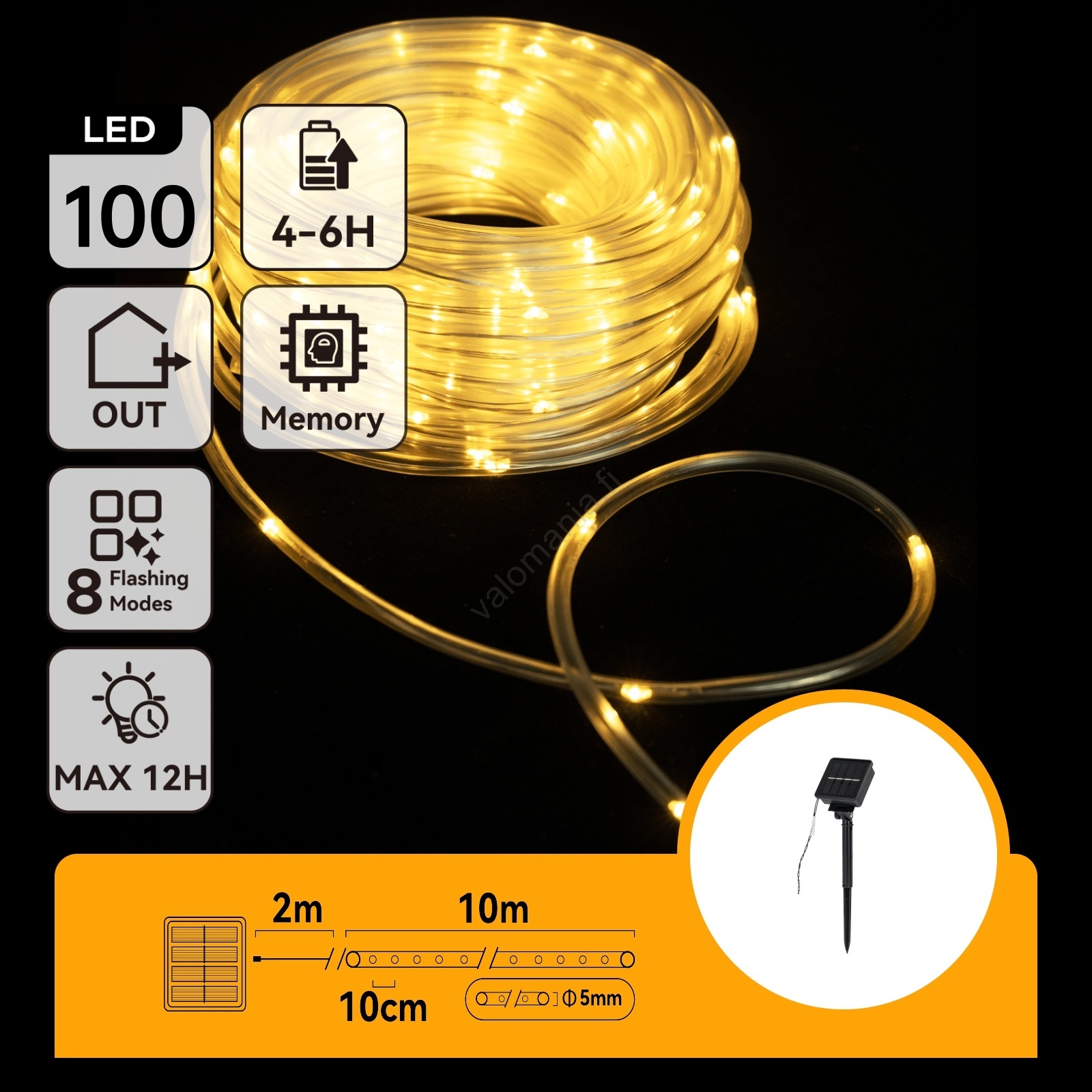 • Aurinkokäyttöinen joulukoristevalosarja, joka sopii erinomaisesti puutarhan koristeluun.