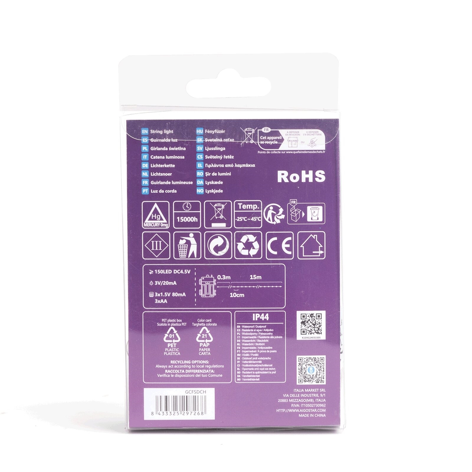 • Aigostar - LED-ulkovaloketju 150 LEDiä/8 toimintoa/3xAA 15,3 m IP44 kylmänvalkoinen