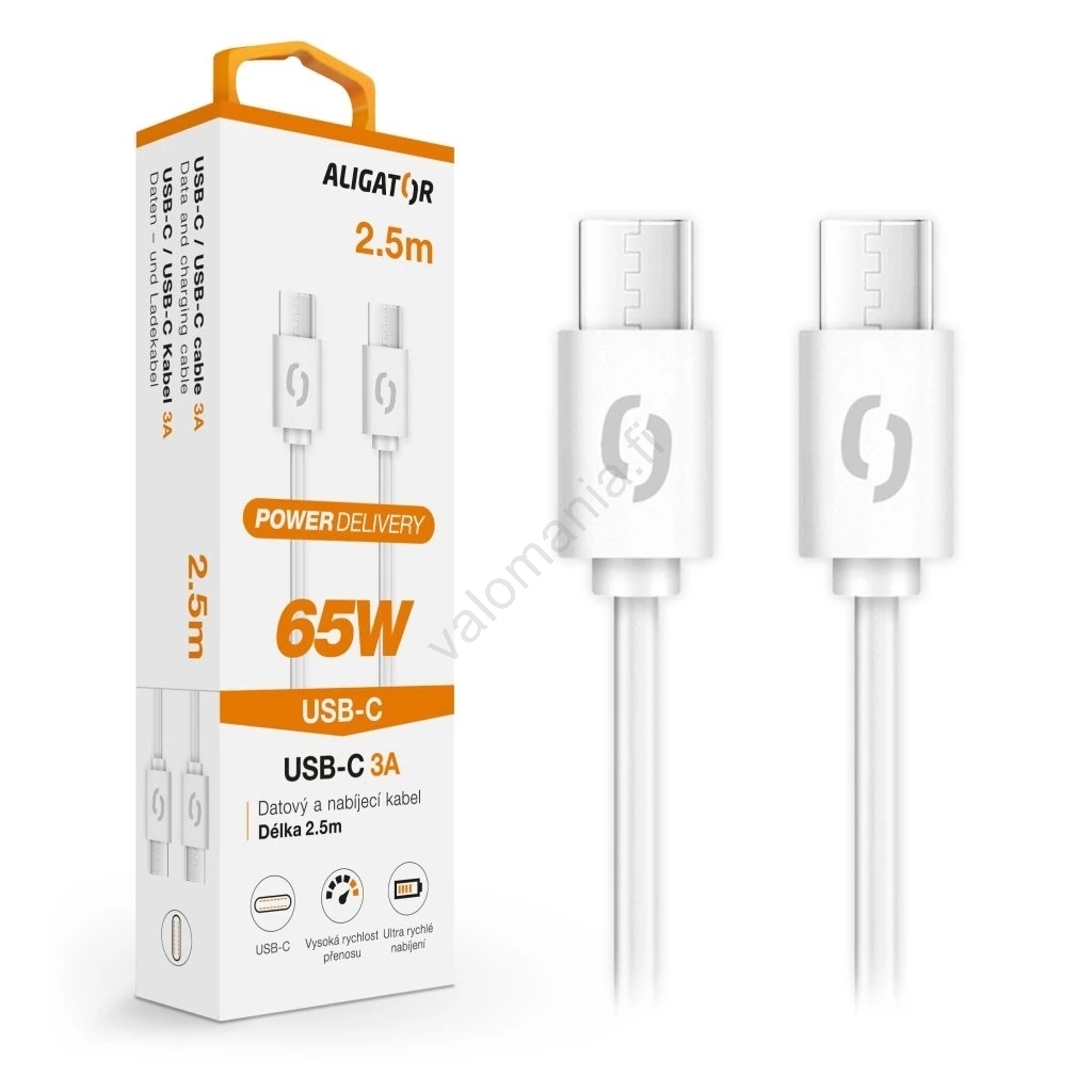 Aligator DATKP59 - USB-kaapeli USB-C / USB-C 65 W Power Delivery 2,5 m valkoinen | Valomania