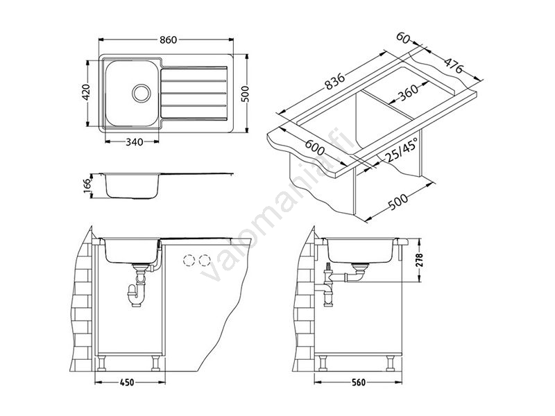 • Pakkauksen sisältö: ruostumattomasta teräksestä valmistettu allas, kiinnikkeet ja tiivisteet, sihtiventtiili 3 1/2, viemärilukko astianpesukoneen liitännällä.