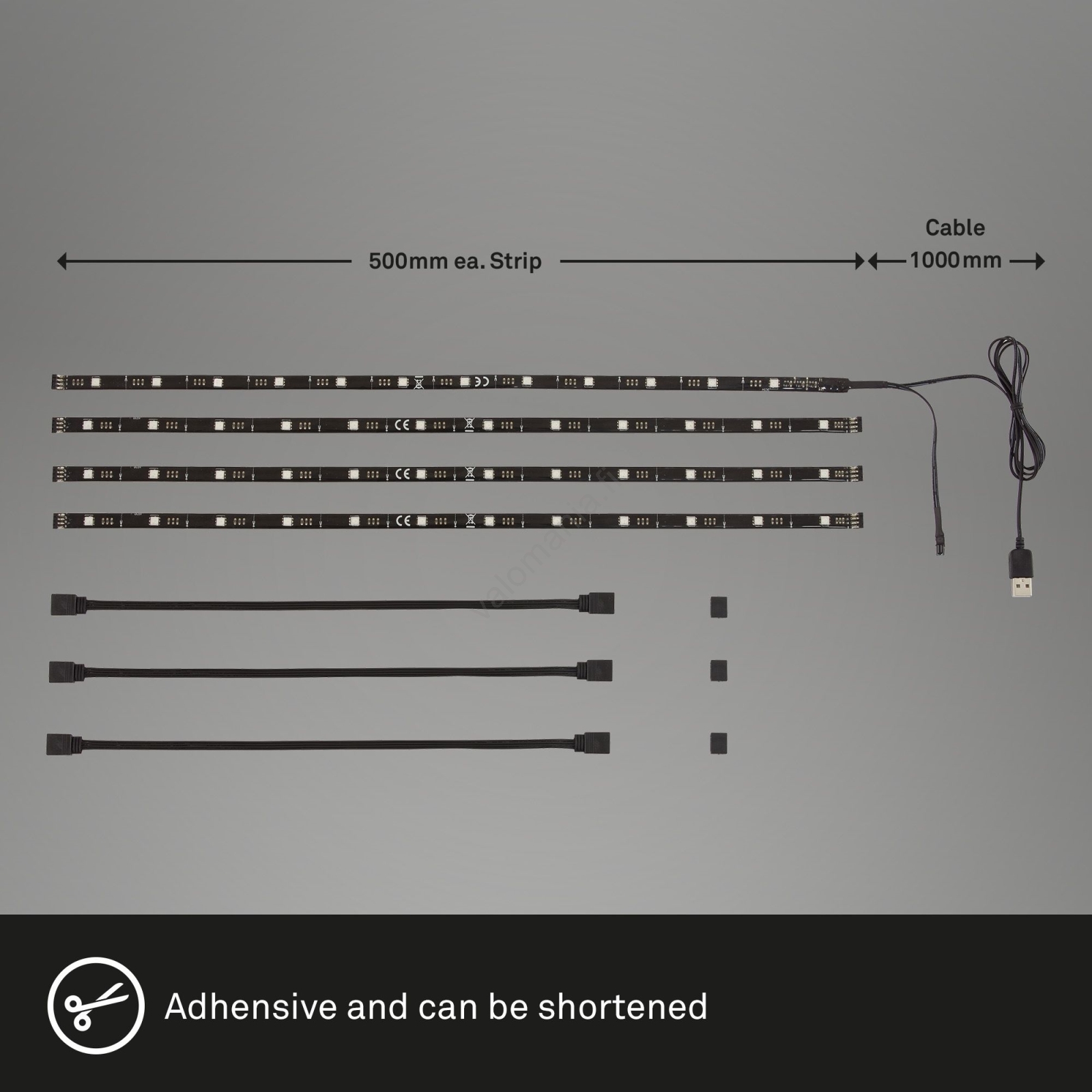 • Pakkaukseen sisältyy kaukosäädin, USB-liitäntä, 3x liitin, 3x jatkokaapeli.