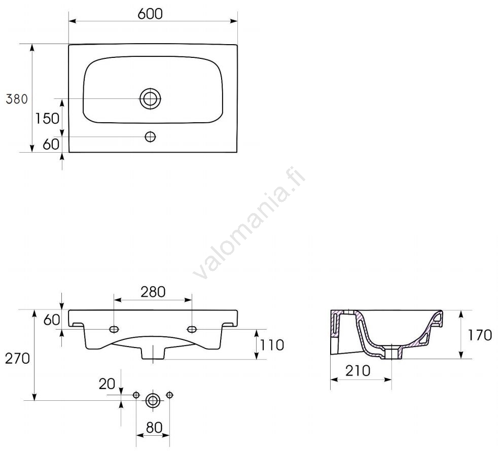 • Keraamisella pesualtaalla on klassinen suorakaiteen muoto, jossa on hana-aukko ja ylivuoto.