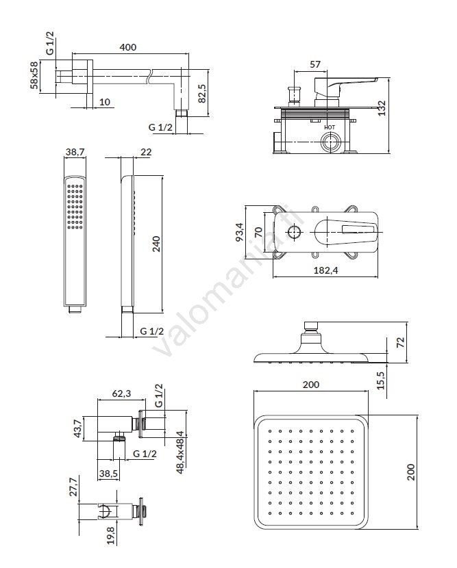 Brändit, Cersanit, Hanat, Kylpyhuone, Piilotetut hanat, Suihkahanan upotettavat osat, Suihkusarjat, Suihkusetit