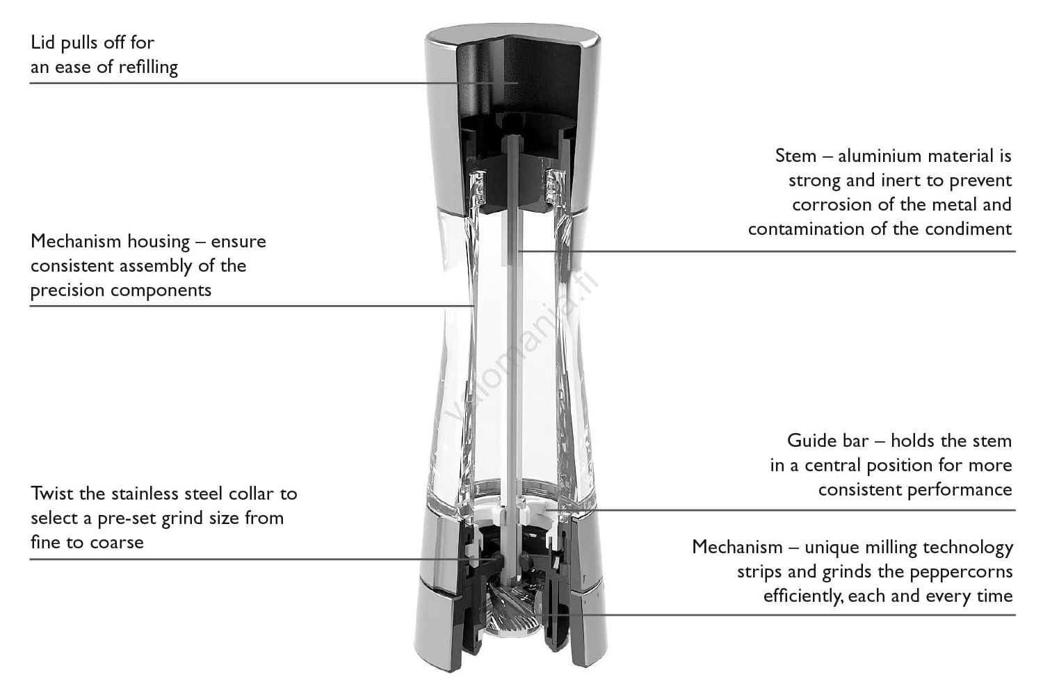 • Myllyt on varustettu kovametallista valmistetulla mekanismilla (pippuri) ja timanttiterävällä keramiikkajauhamismekanismilla (suola).