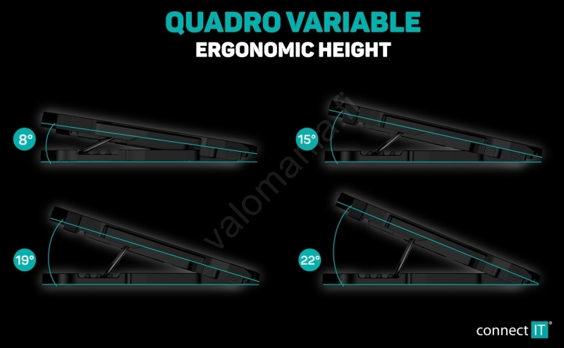 • Kannettavan tietokoneen taitettava tuki jäähdyttimen alaosassa, jossa on pehmustettu sisäpinta.