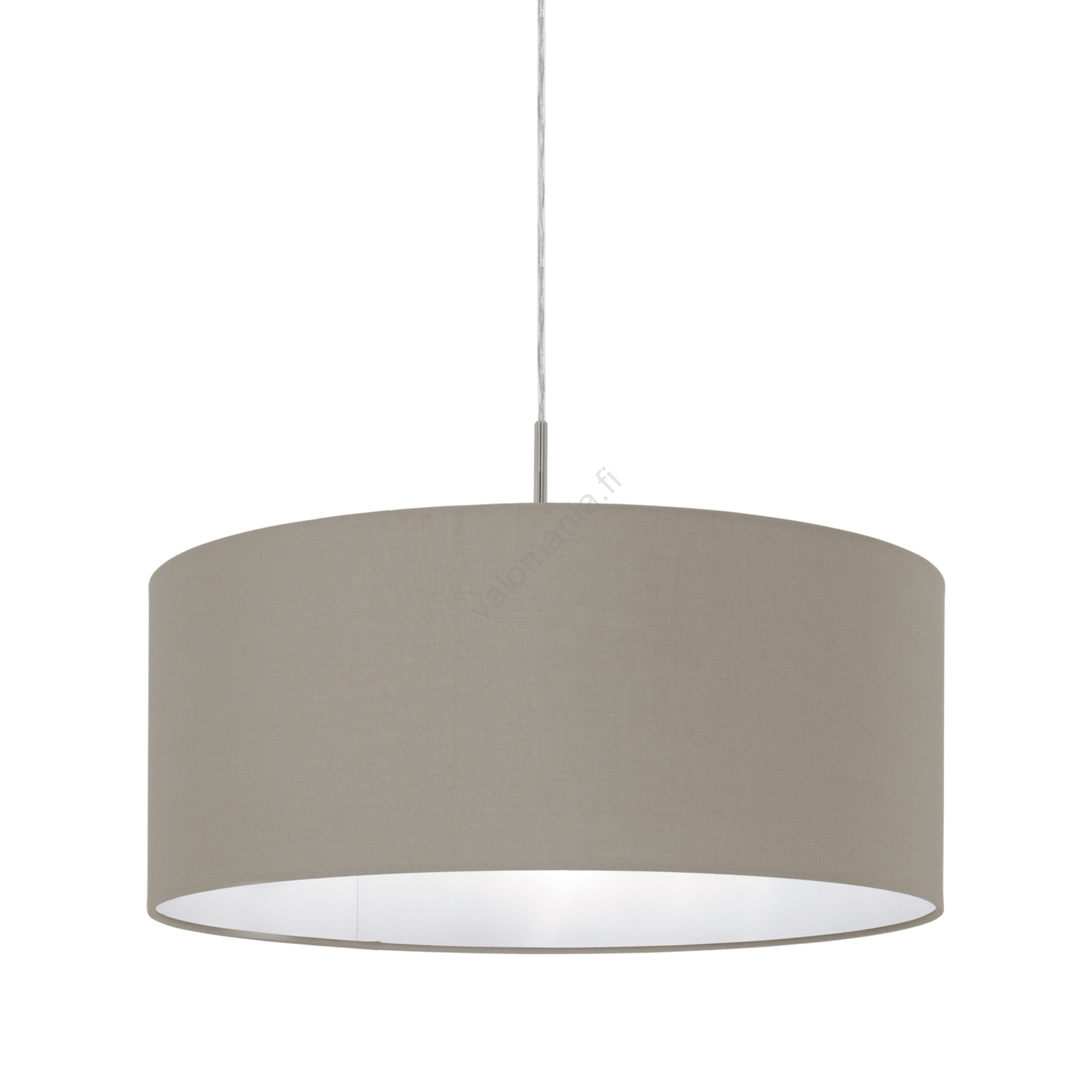 • Valaisimen ulkonäköä korostaa harmaanbeige tekstiilivarjostin, jota täydentää metallinen ripustus.