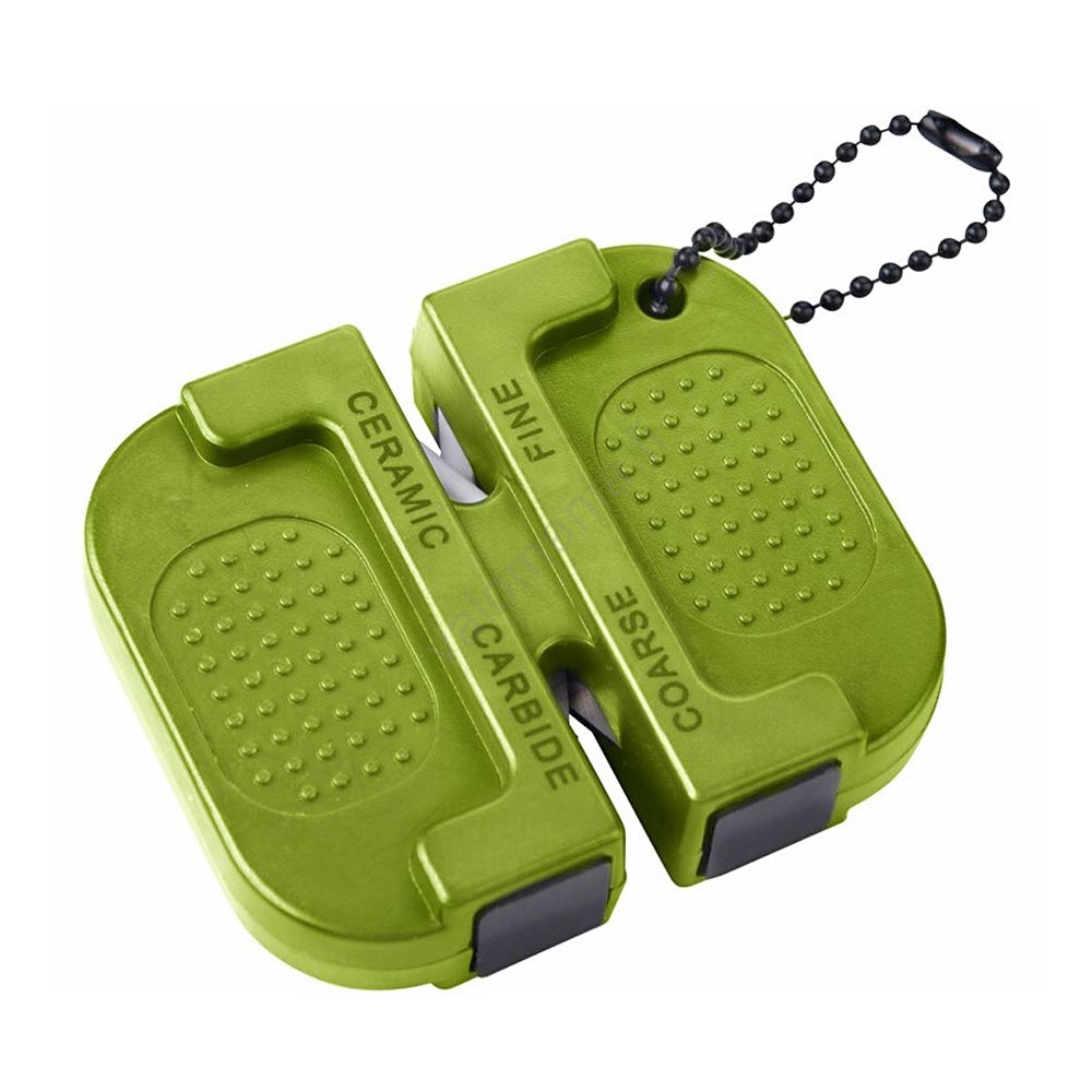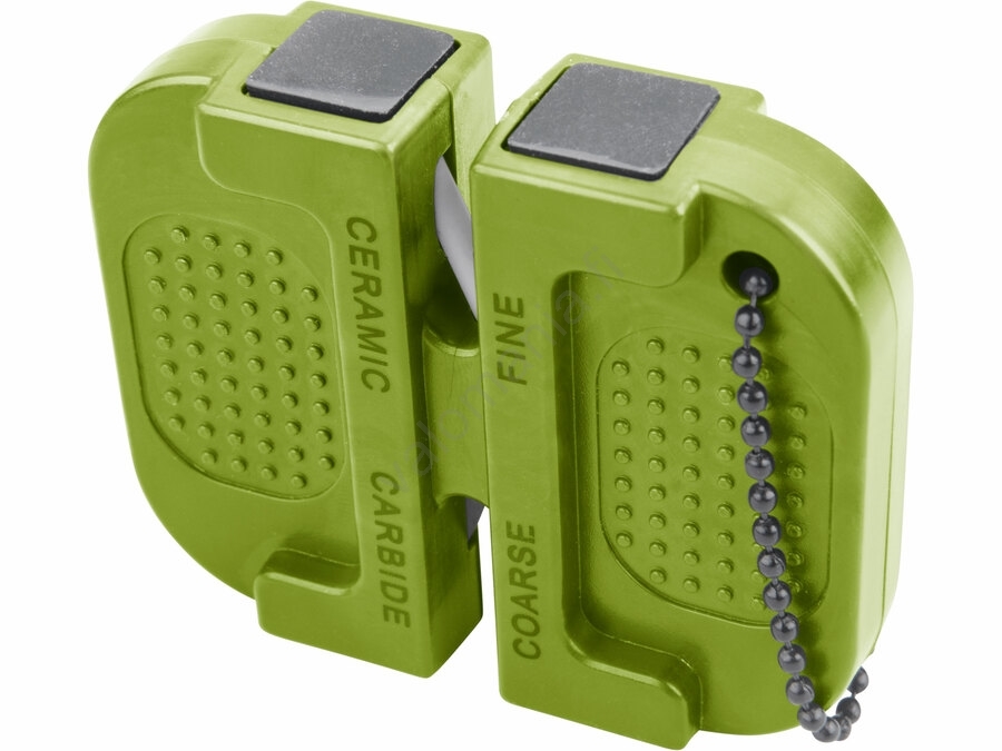 • Pieni ulkokäyttöön tarkoitettu veitsenteroitin, jossa on ketju ja karkeaan teroitukseen käytettävät kaksi volframikarbidilevyä.