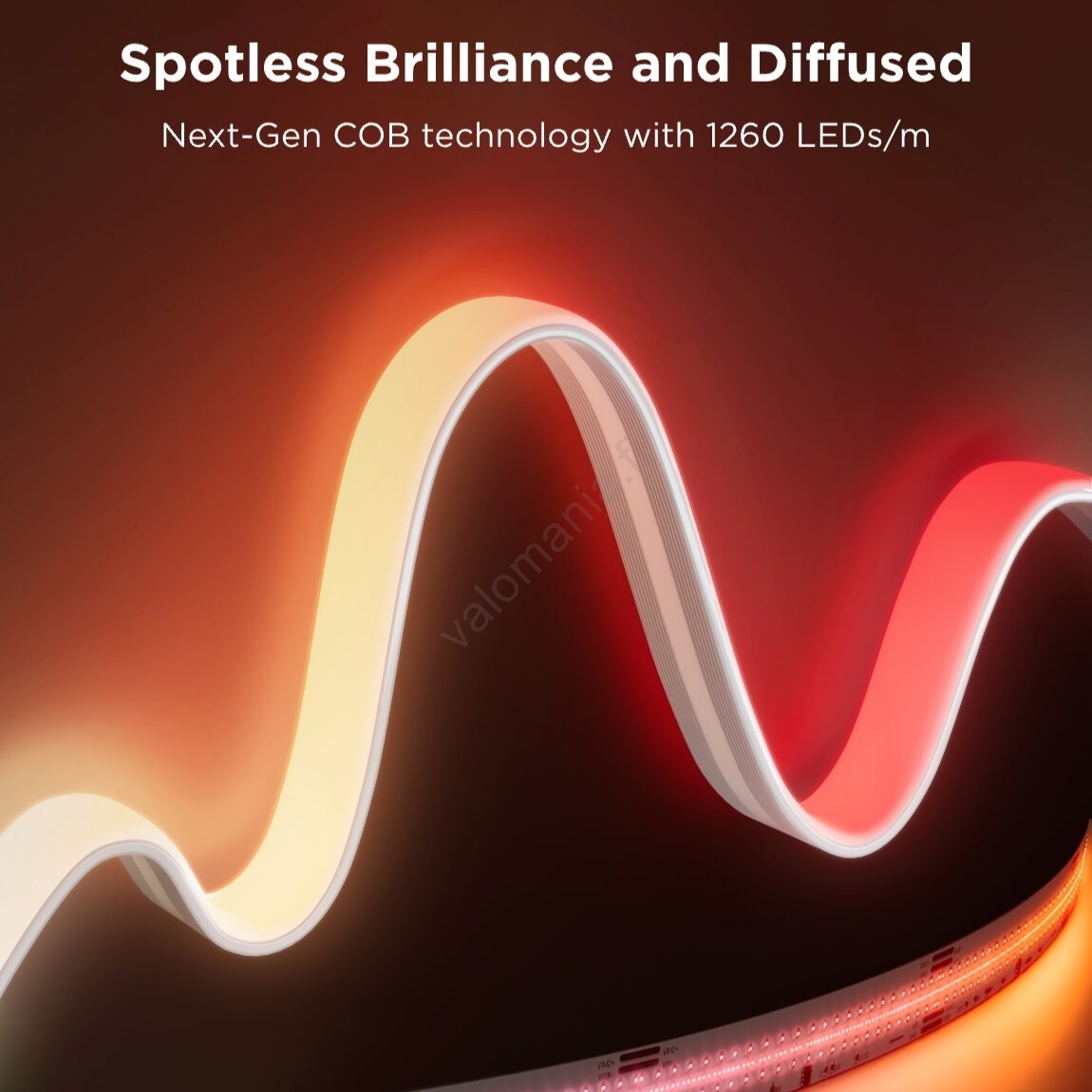 • COB-tekniikan (Chip on Board) ja 1260 LEDin tiheyden metrillä (yhteensä 3780 diodia) ansiosta tämä valonauha tarjoaa jatkuvan virtauksen poikkeuksellisen kirkasta ja tasaista valoa ilman näkyviä yksittäisiä diodipisteitä.