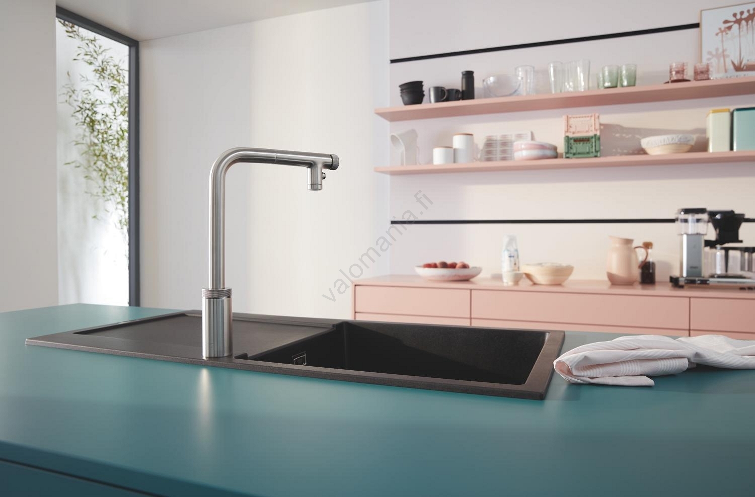 • GROHE K500 -kvartsikomposiittiallas valutusosalla – vankka tuote, joka on helppo puhdistaa ja vaimentaa melua.
