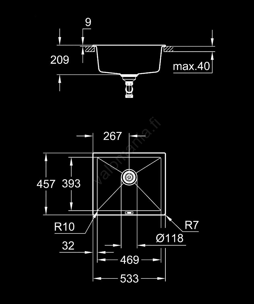 • Kokonaismitat: 533 x 457 mm; altaan mitat: 469 x 393 x 205 mm.