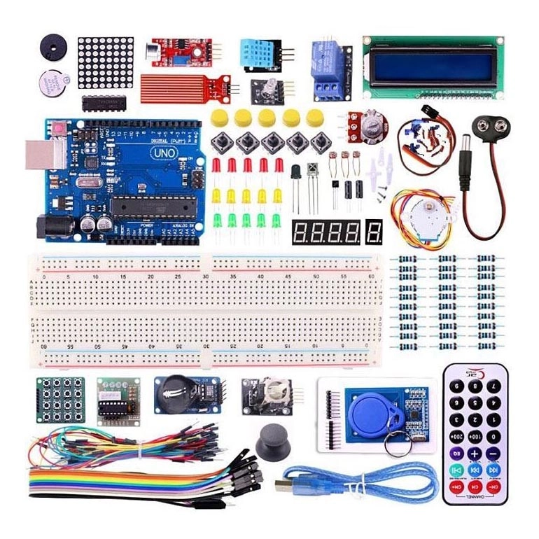 • Arduino UNO R3 perusmoduuli - ATmega328:aan perustuva mikrokontrollerin kehitysalusta, joka sisältää 14 digitaalista tulo-/lähtönastaa (joista 6 voidaan käyttää PWM-tuloina), 6 analogista tuloa, 16 MHz:n kiteen, USB-liitännän, virtaliittimen, ICSP-liitännän ja nollauspainikkeen.