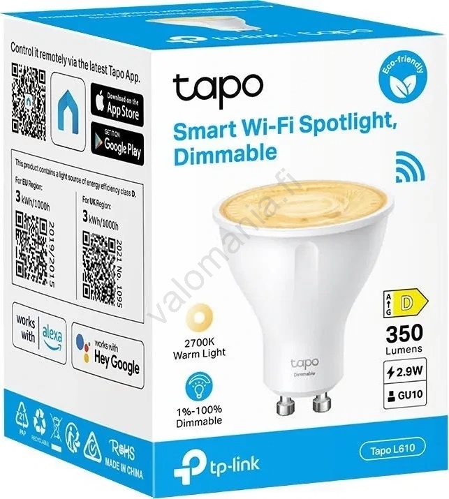 • Älykäs LED-lamppu TP-Link Tapo L610 sopii tavalliseen GU10-kantaan ja toimii ilman erillistä keskitintä.