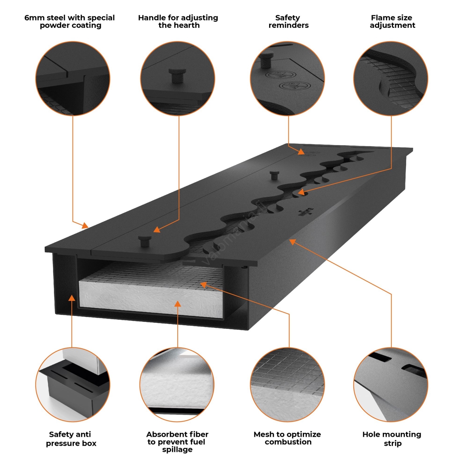 • Turvallinen poltin imeytyvällä insertillä, joka tasapainottaa uunin lämpötilaa ja pidentää biopolttoaineen palamisaikaa.