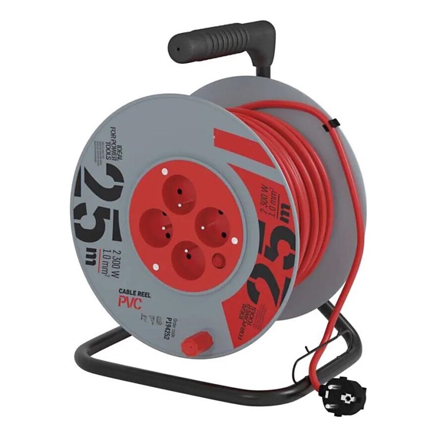 Jatkojohto kelalla, 4 pistorasiaa, 25 m, harmaa/punainen