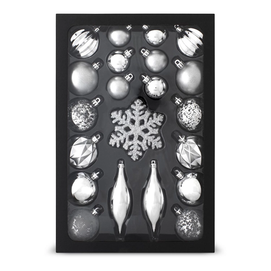 • 25 kappaleen joulukoristeiden sarja perinteisessä hopeanvärissä.