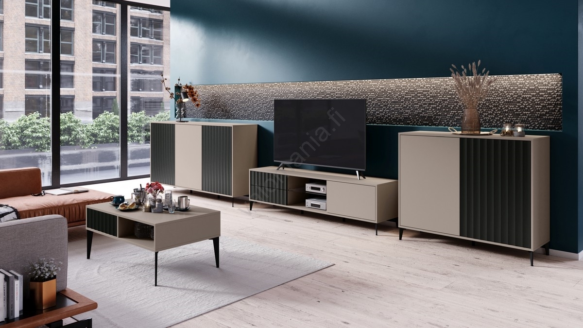 • Minimalistinen olohuonekalustekokonaisuus, joka erottuu yksinkertaisilla muodoillaan ja riflatuilla etulevyillään, luoden ainutlaatuisen ja tyylikkään ilmeen.