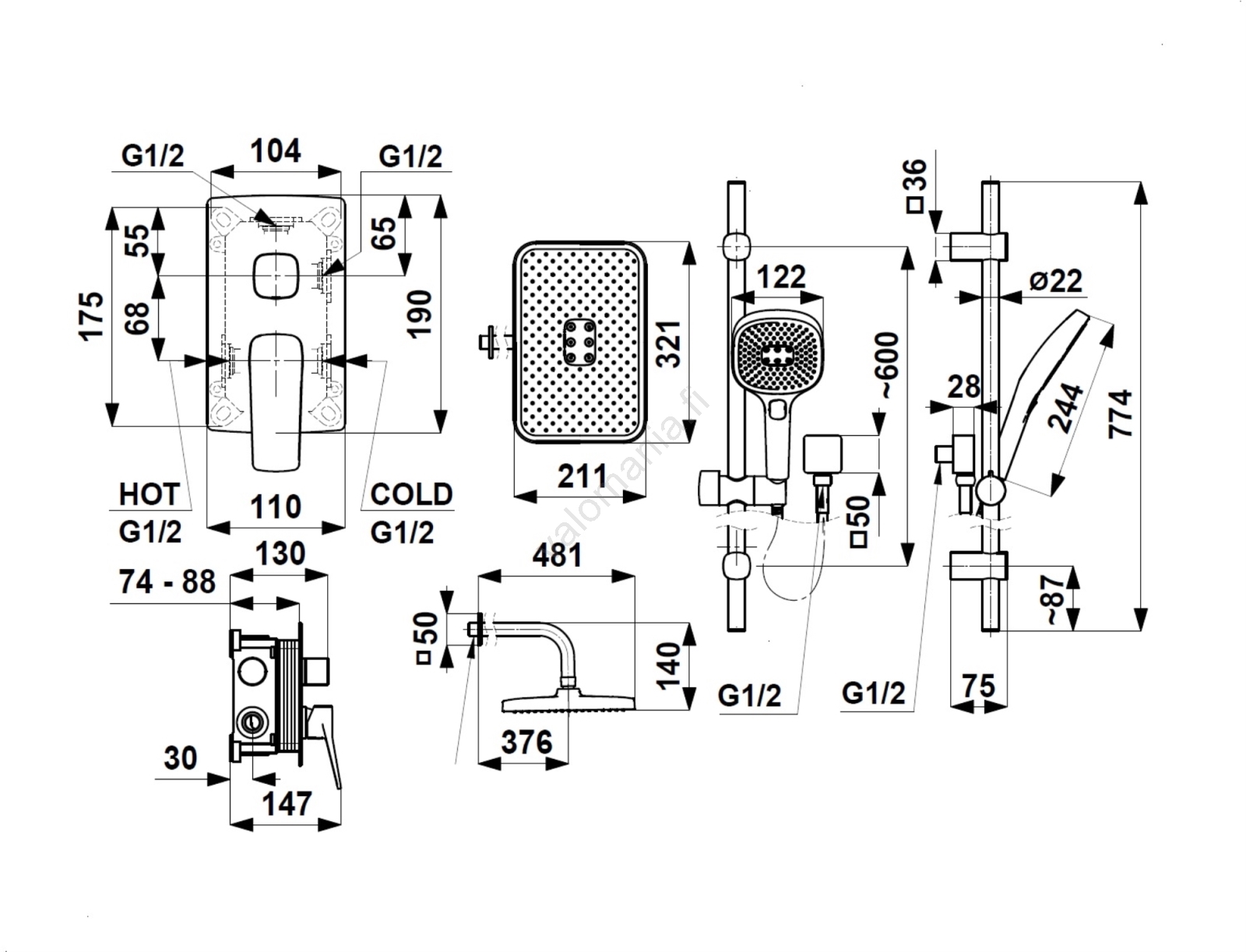 • Pakkaus sisältää: uppoasennusrunko, kompletti hana, suihkuvarsi, suihkupää letkulla, piilotettu liukukiskollinen käsisuihku.