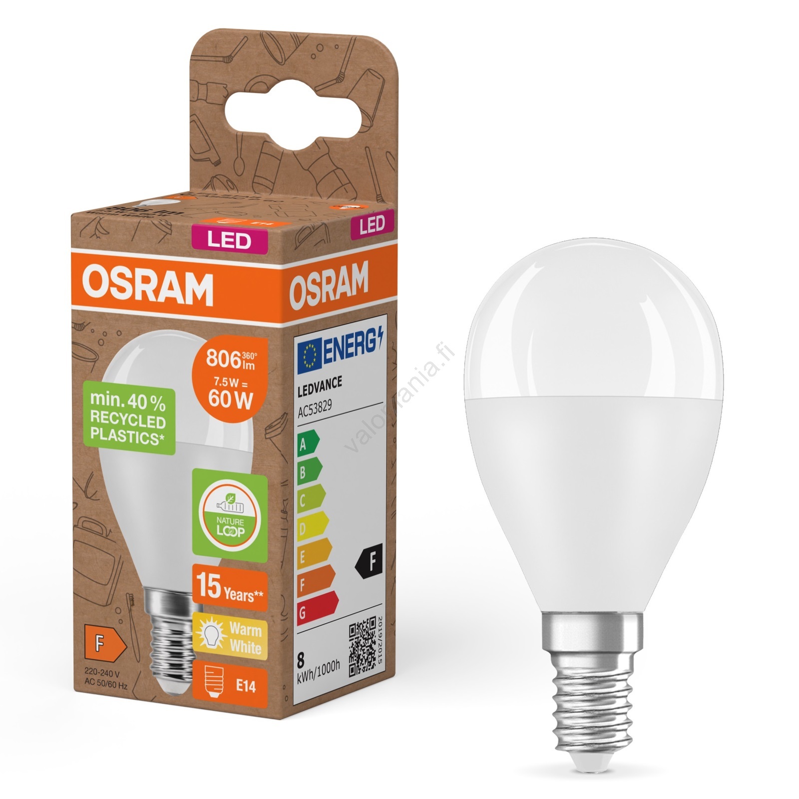 Kierrätetystä muovista valmistettu LED-polttimo P45 E14/7,5W/230V 2700K - Osram | Valomania