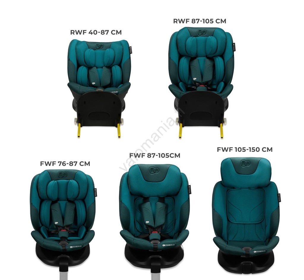 • Matkustaminen vastakkaiseen ajosuuntaan (RWF) on mahdollista jopa neljän vuoden ikään asti, mikä parantaa merkittävästi suojaa etutörmäyksessä.