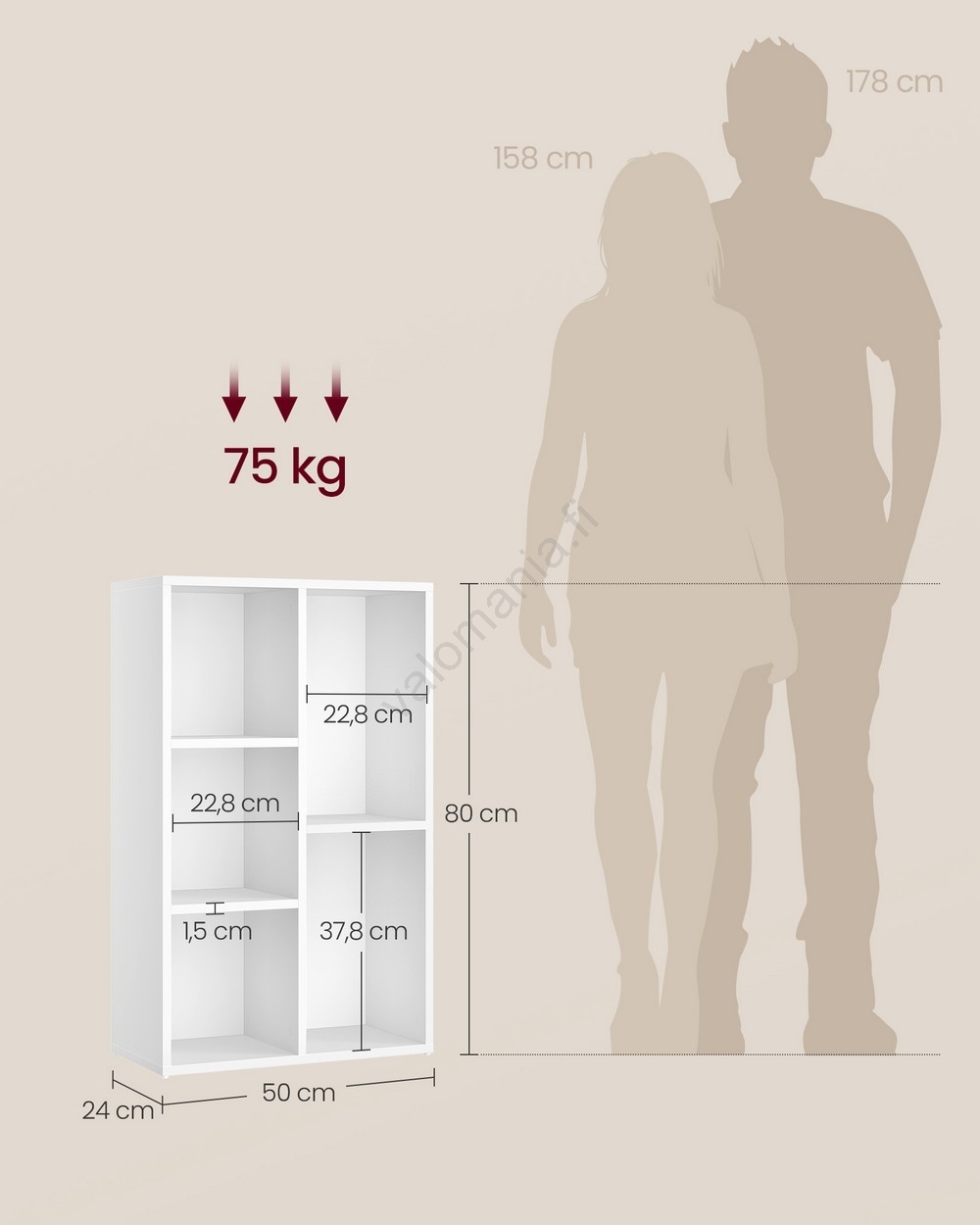 • Viiden lokeron ansiosta (kunkin kantavuus 15 kg) ja ylähylly voit säilyttää siinä kirjoja, figuureja, koristeita ja muita esille sopivia esineitä.