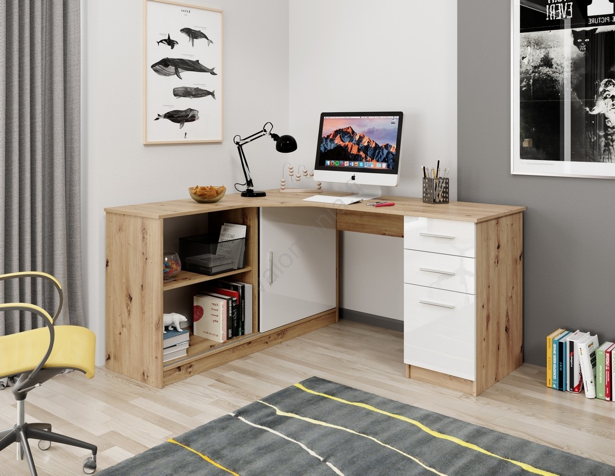 Kirjoituspöytä ROBERTO hyllyllä ja laatikoilla, vasenkätinen, artisan-tammi/valkoinen | Valomania