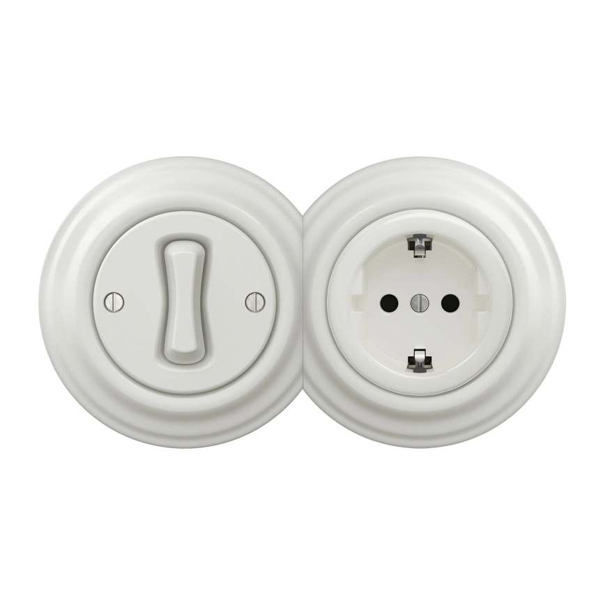 Kliklap - Retro yksinapainen kytkin nro 1 ja SCHUKO 230V-pistorasia kehyksellä, valkoinen | Valomani