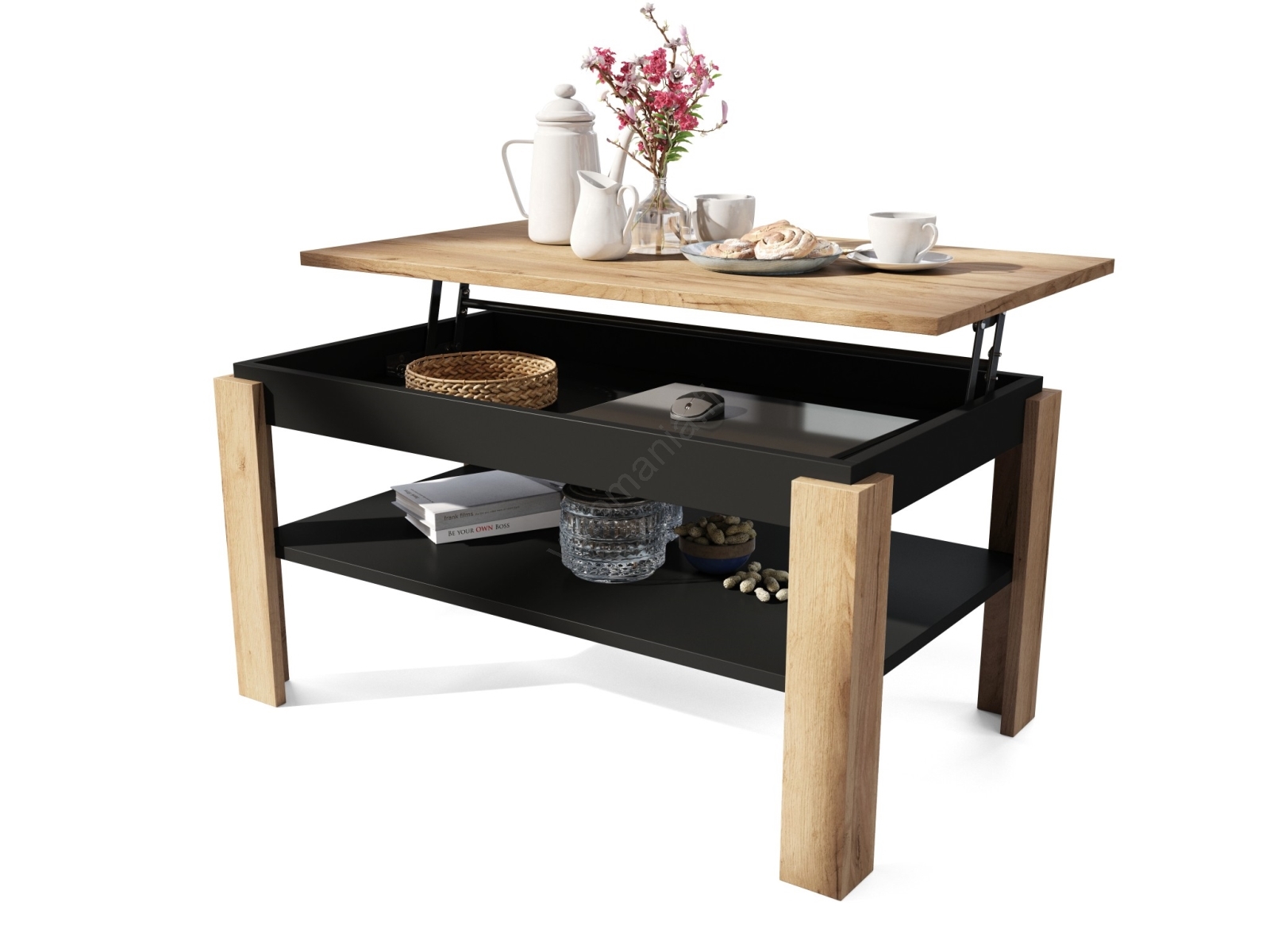 • Laajennettava sohvapöytä nostettavalla kannella ja hyllyllä ADEN tammi craft/musta
