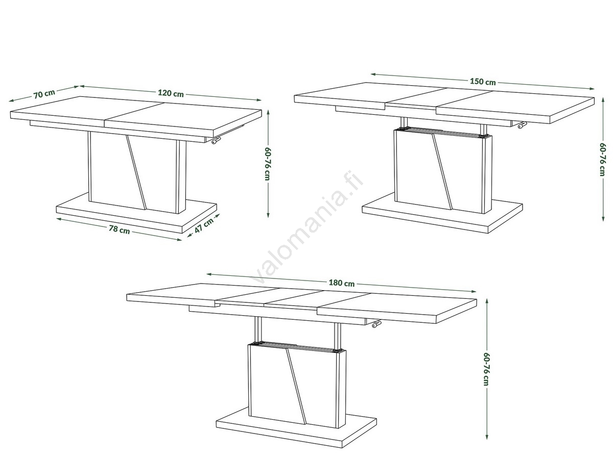 • Kahden 30 cm jatkopalan ansiosta pöytälevy voidaan laajentaa 150 tai 180 cm:iin.