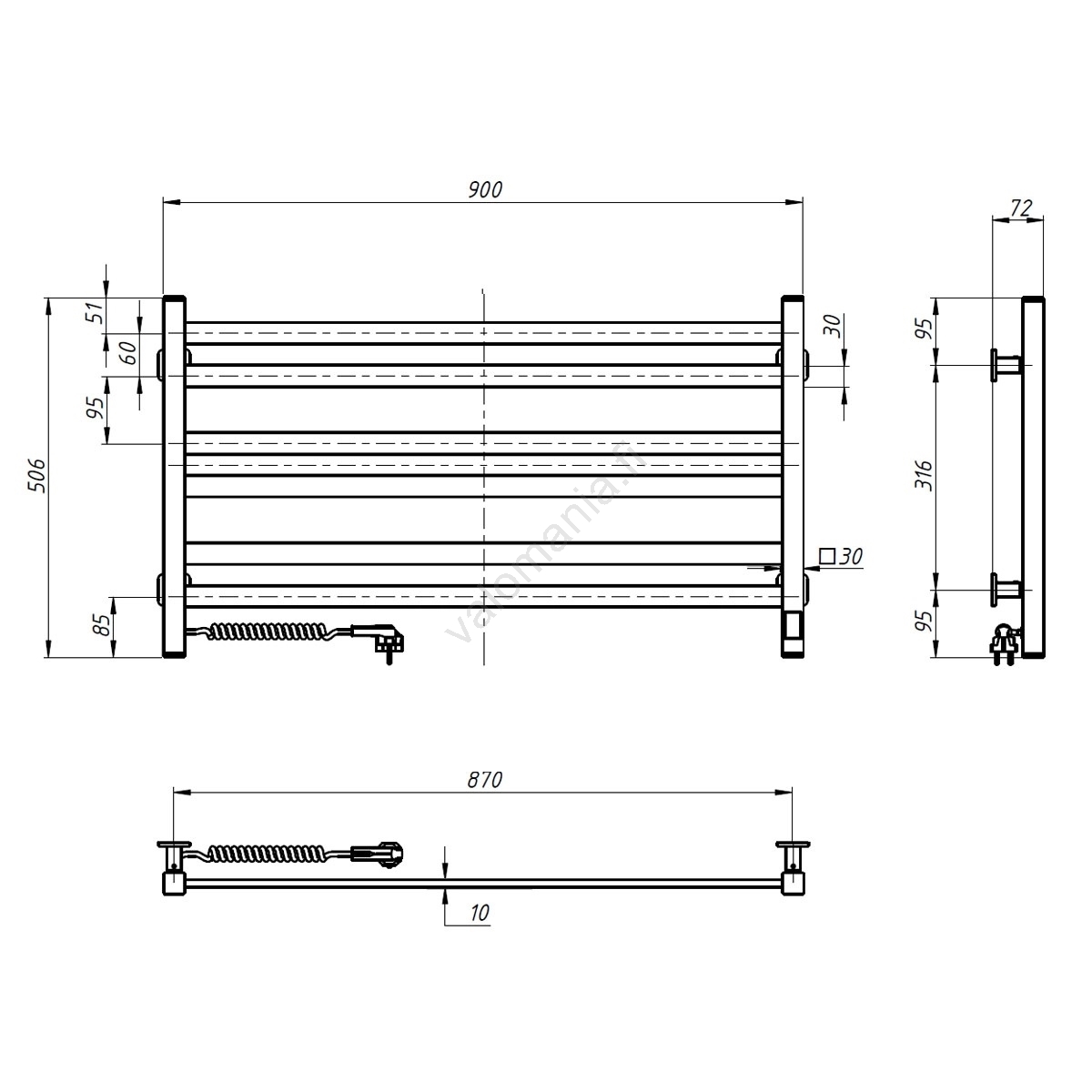 Sähköinen pyyhekuivain termostaatilla AVANGARD 181W 50x90 cm valkoinen vasen | Valomania