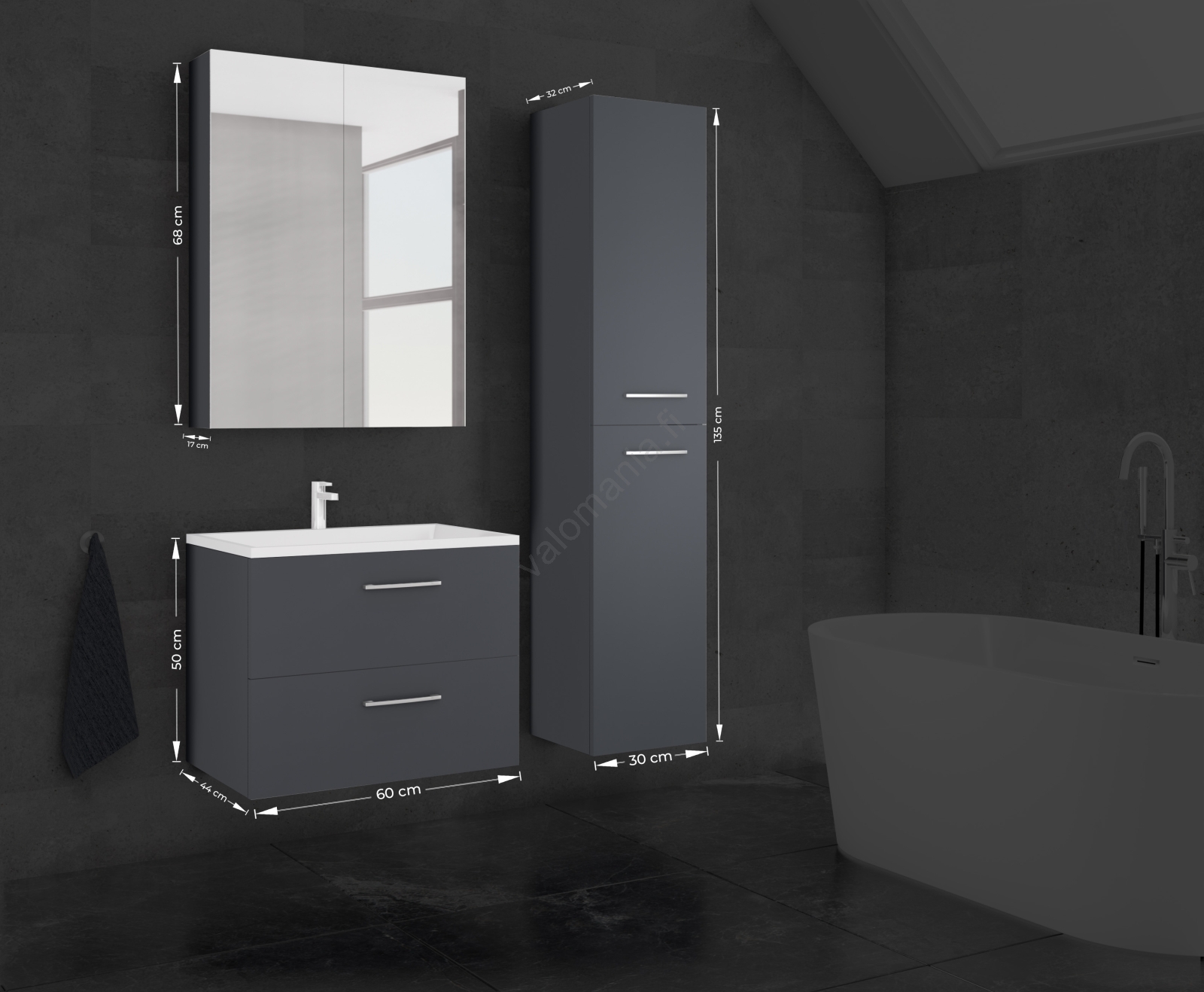 Kylpyhuonekaappi KATE pesualtaalla + peilikaappi + seinäkaappi, antrasiitti | Valomania