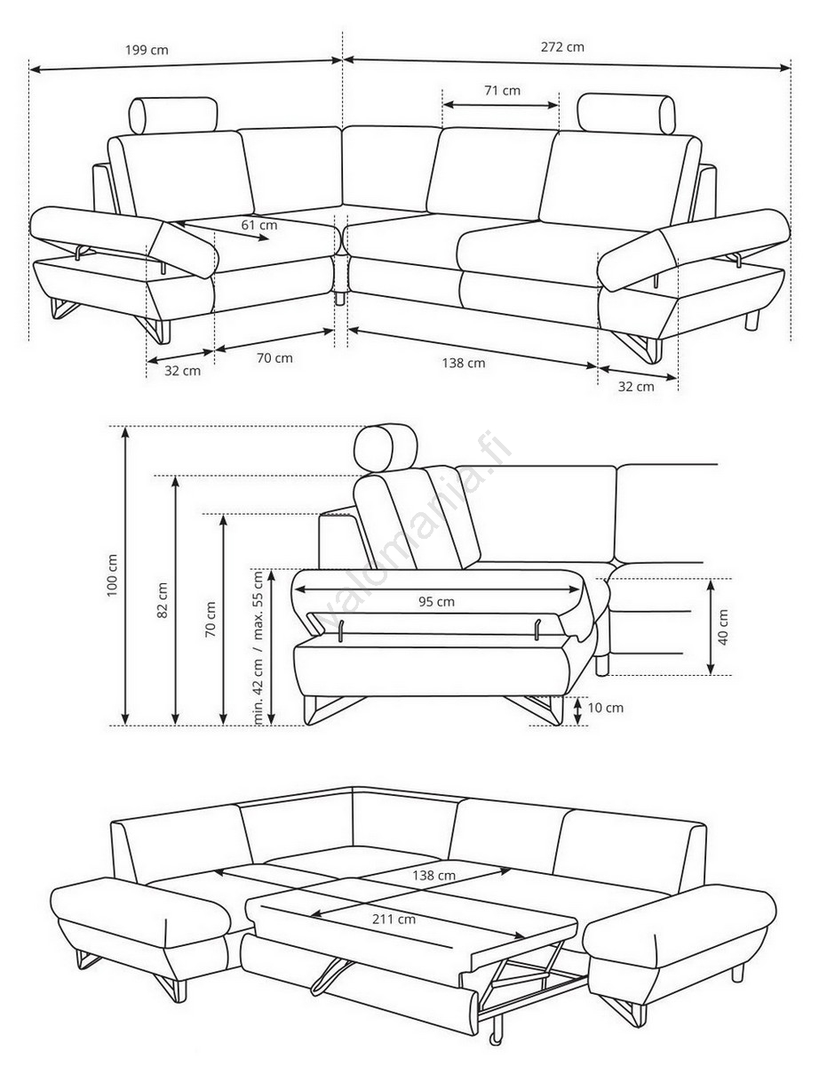 • Sohvassa on tilava säilytystila vuodevaatteiden ja muiden kausitavaroiden säilyttämiseen.