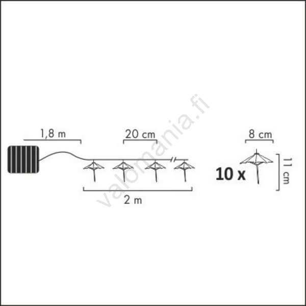 LED aurinkoketju 10xLED/1,2V 300mAh 3,8m IP44 sateenvarjoille | Valomania