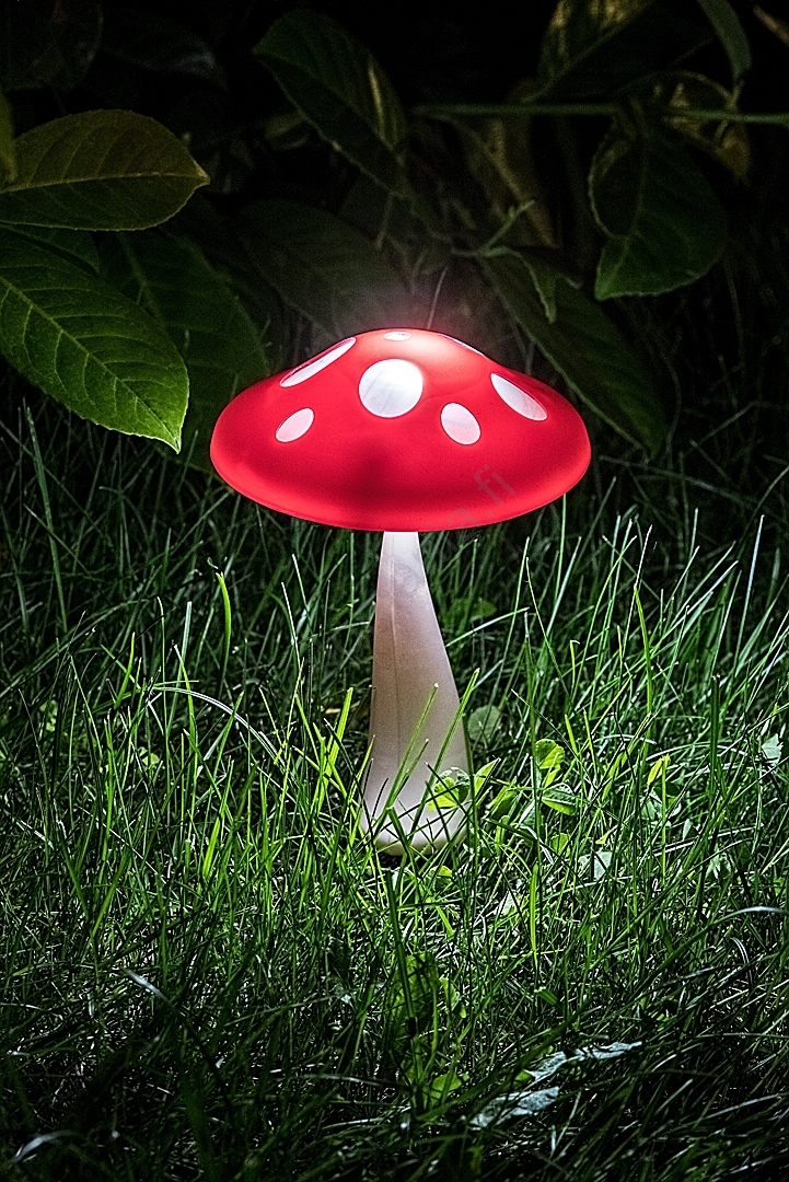 Funghetto-aurinkolamppu, jonka muotoilu on punaisen kärpässienen kaltainen, tuo varmasti iloa ja luonnollista viehätystä puutarhaasi talon ympärillä. Valkoinen ja punainen väriltään muovinen koristevalaisin perinteisessä tyylissä on maahan upotettava ja siinä on sisäänrakennettu LED-valonlähde. Energiatehokkaan valonlähteen teho on 0,06 W ja sen värilämpötila on 4000 K. Aurinkokennon tiedot ovat seuraavat: AAA NiMH 300 mAh. Ulkokoristevalon korkeus on 185 mm ja varjostimen halkaisija 120 mm. Sen IP44-luokitus takaa, ettei siihen pääse esineitä, joiden maksimihalkaisija on 1 mm, ja se on suojattu roiskuvalta vedeltä kaikista suunnista.