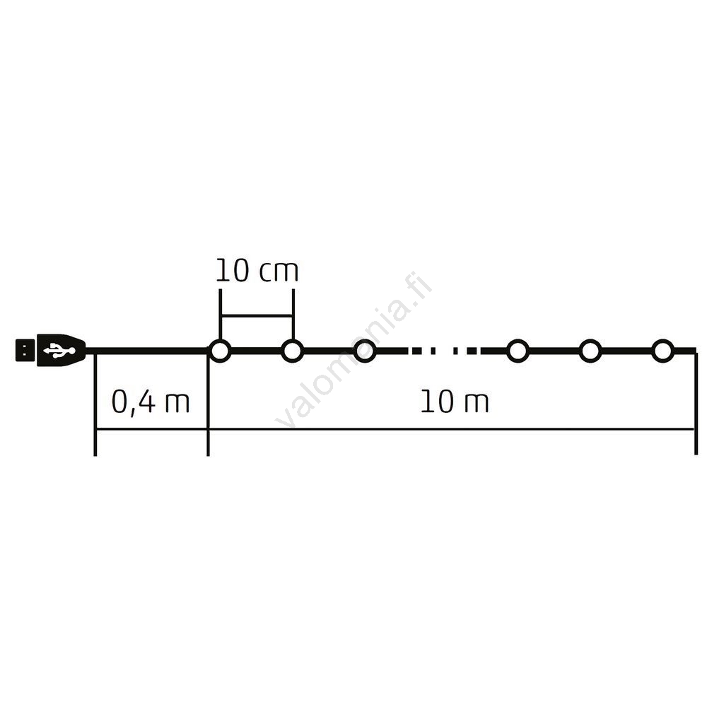 • Valaisinosan pituus on 10 metriä ja se sisältää yhteensä 100 LEDiä.