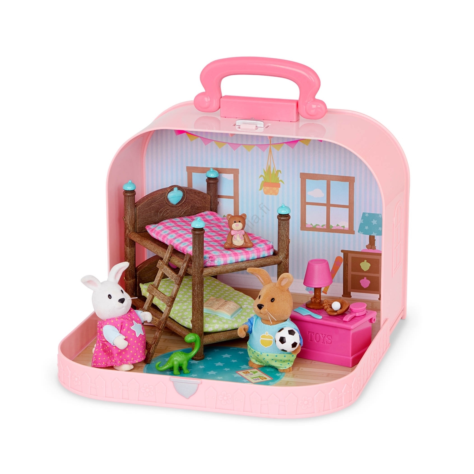 • Laukku avattuna muuttuu monipuolisesti varustelluksi lastenhuoneeksi, jossa on huonekaluja, tarvikkeita ja pupuhahmot Chuck ja Amelie.