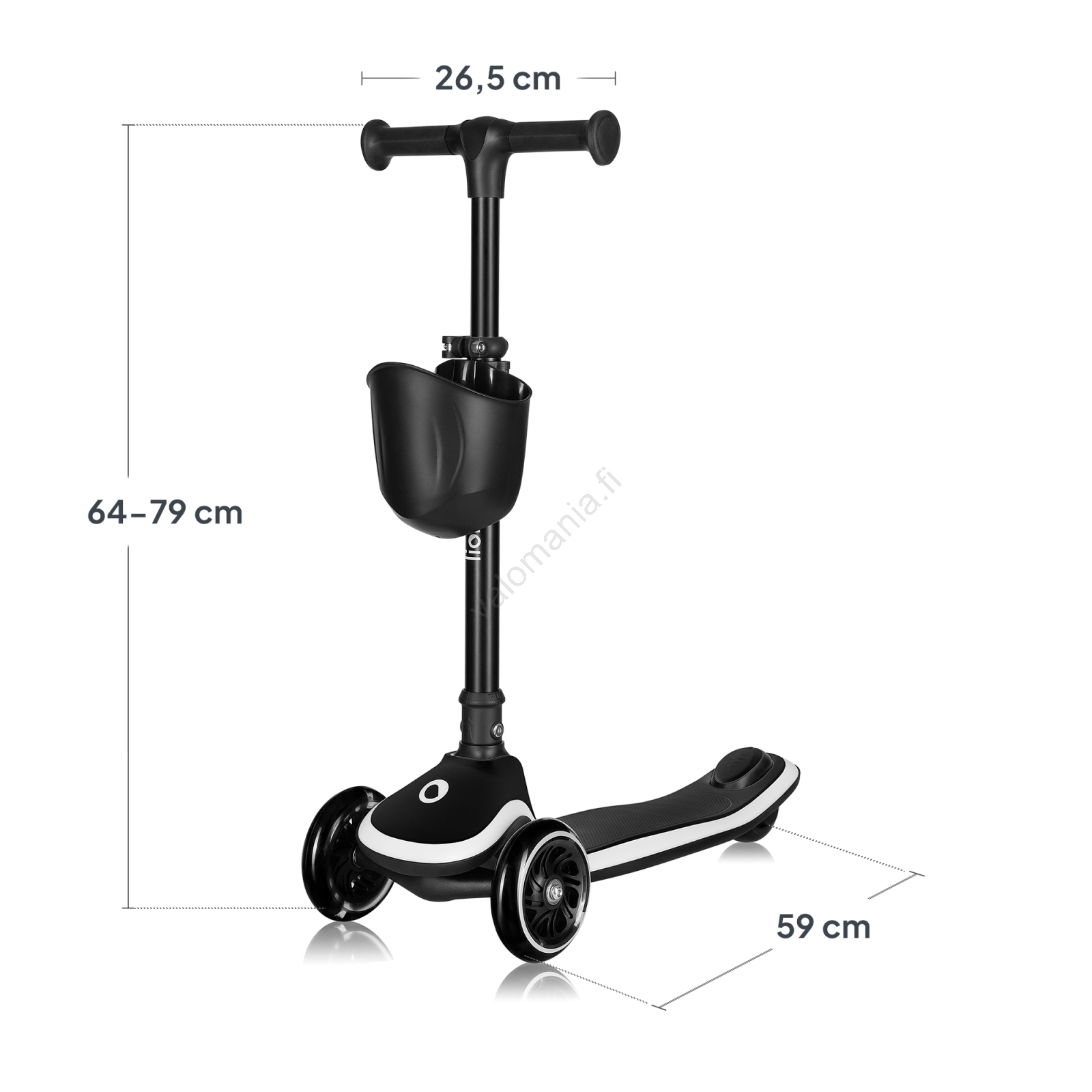• Ohjaustangon korkeutta voi säätää 4 tasoon (64–79 cm), mikä mahdollistaa potkulaudan käytön noin 3-vuotiaasta aina 50 kg painoiselle lapselle.