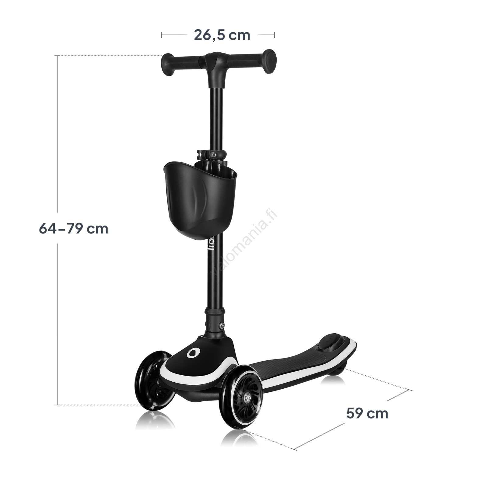 • Ohjaustangon korkeutta voi säätää neljällä tasolla (64–79 cm), mikä mahdollistaa potkulaudan käytön noin 3-vuotiaasta alkaen aina 50 kg painaviin lapsiin saakka.