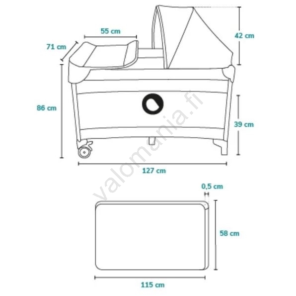 • Pakkauksen sisältö: hoitotaso sivutaskuilla (vaipoille, talkille yms.), tarvikekori, jossa on kaksi lokeroa, suuri hyttysverkko, katos ja lelukaari pehmoleluilla.