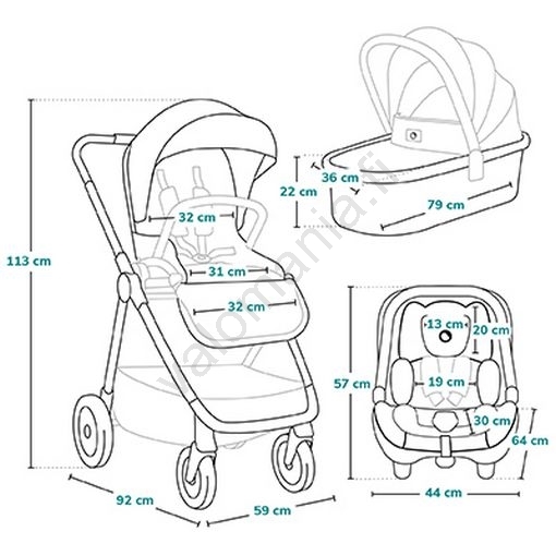 • Lisävarustepaketti: jalkapeite, sääskiverkko, vaunukopan suojus, sadesuoja, laukku, mukipidike, lukittava kori.