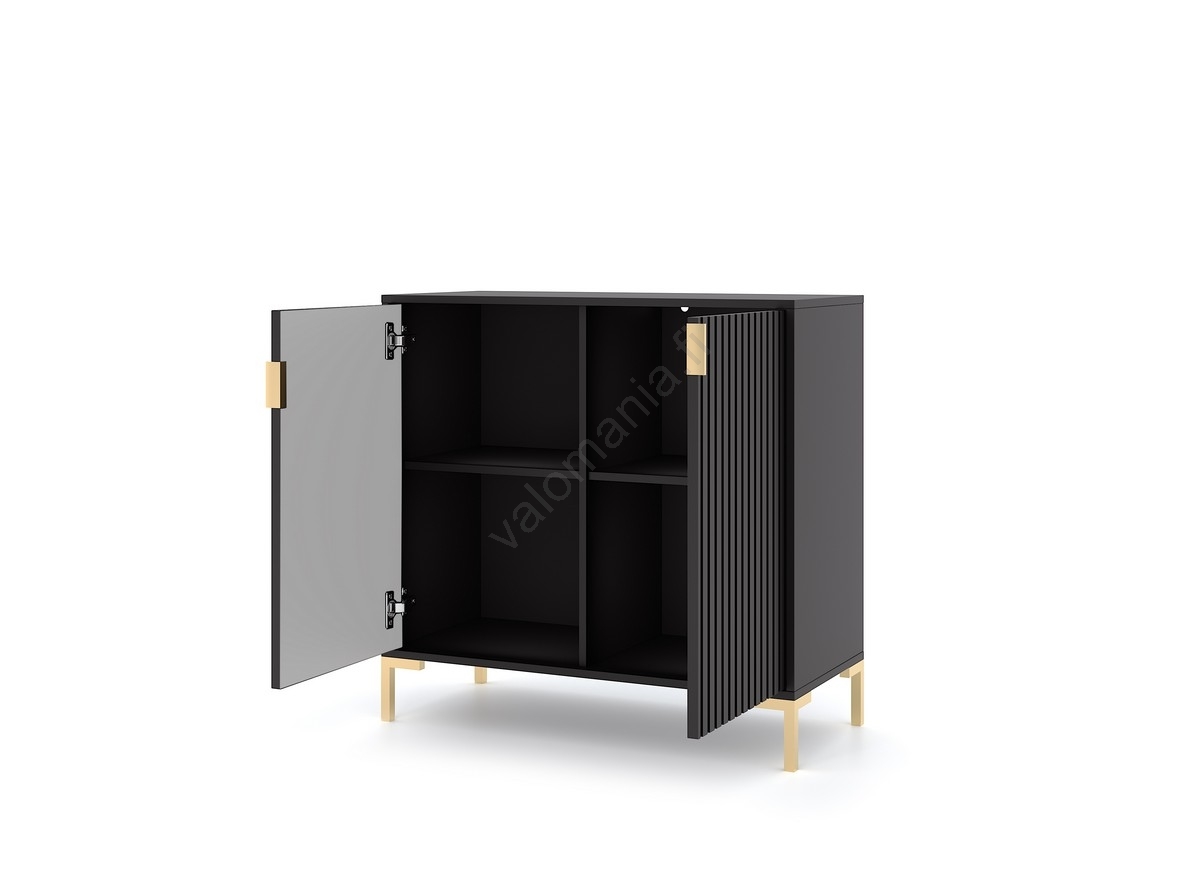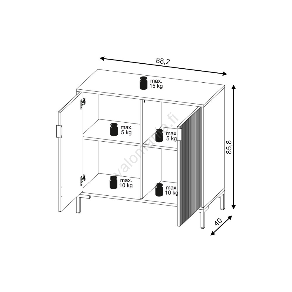 • Siinä on neljä hyllyä ja kaksi ovea, joissa on pystysuorat uurteet.