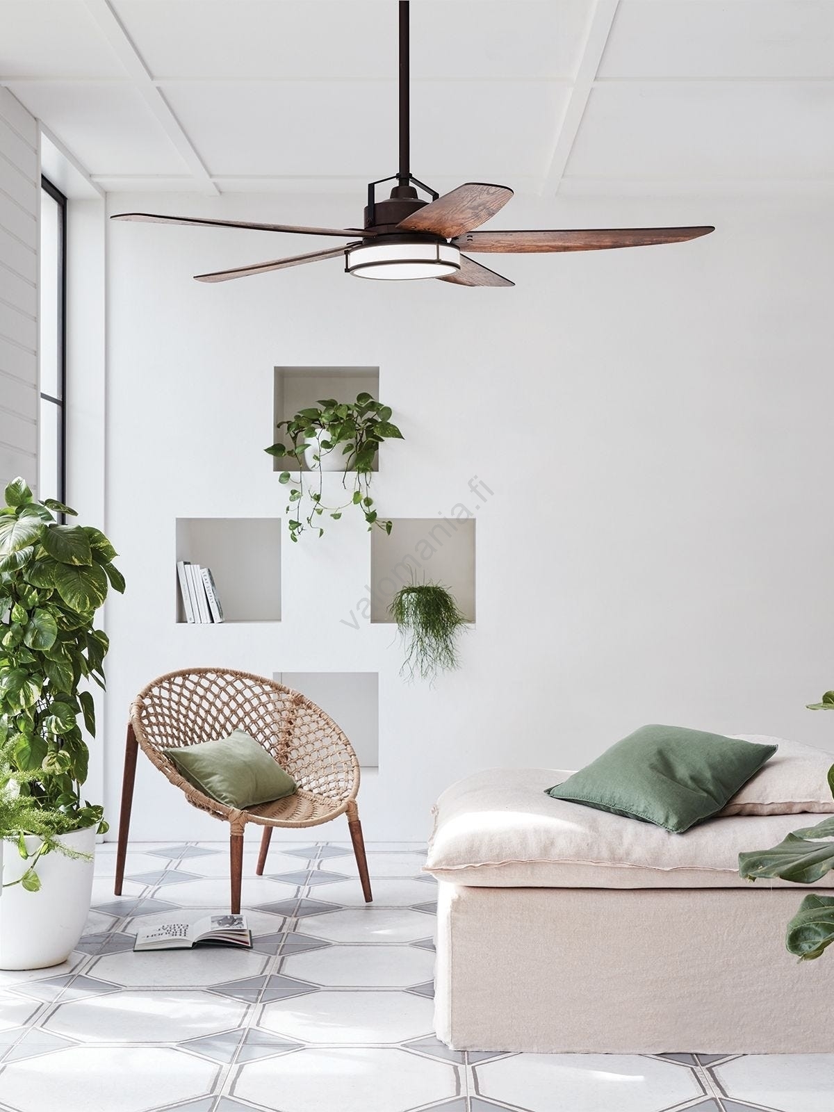• Kattotuuletin elegantilla muotoilulla ja vanerilavoilla.