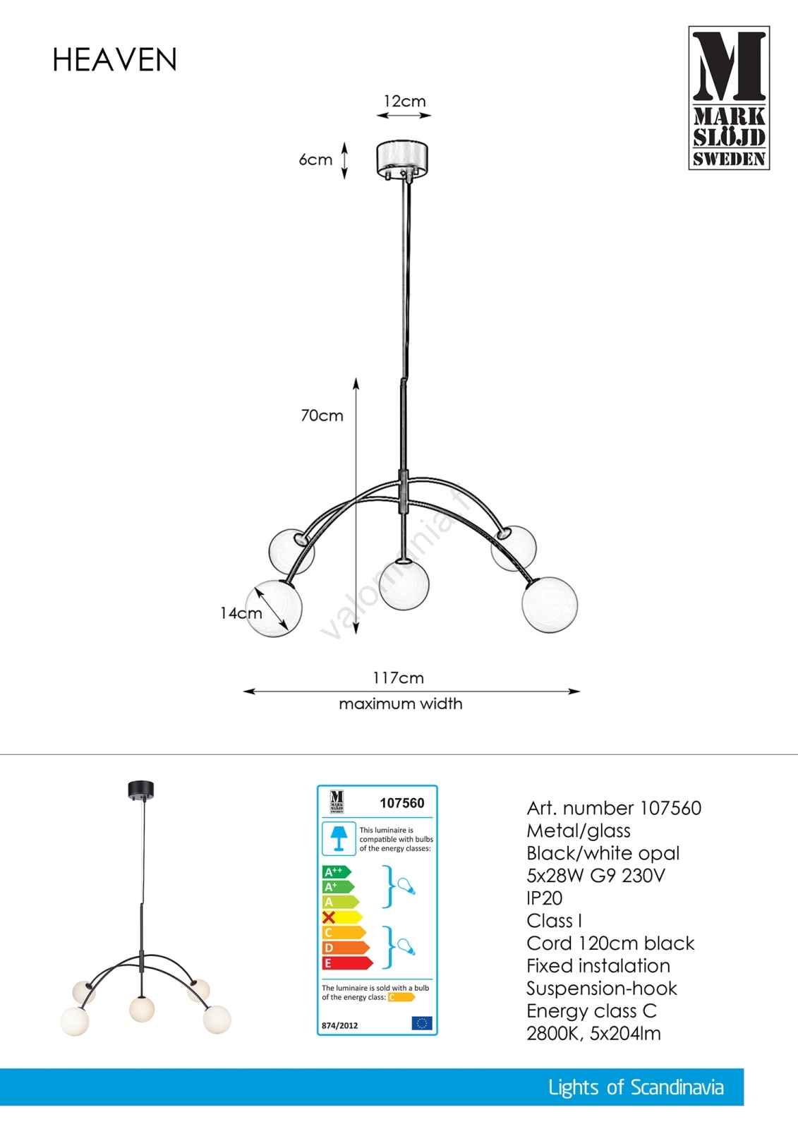 Markslöjd 107560 - Kattokruunu narulla HEAVEN 5xG9/28W/230V | Valomania