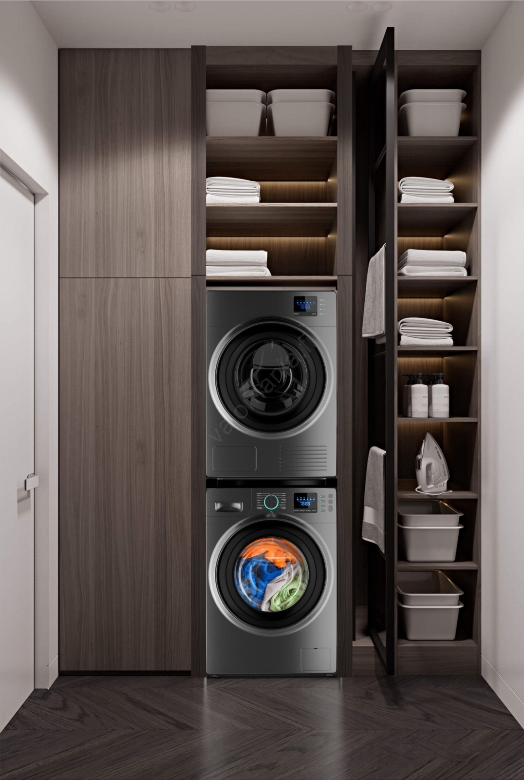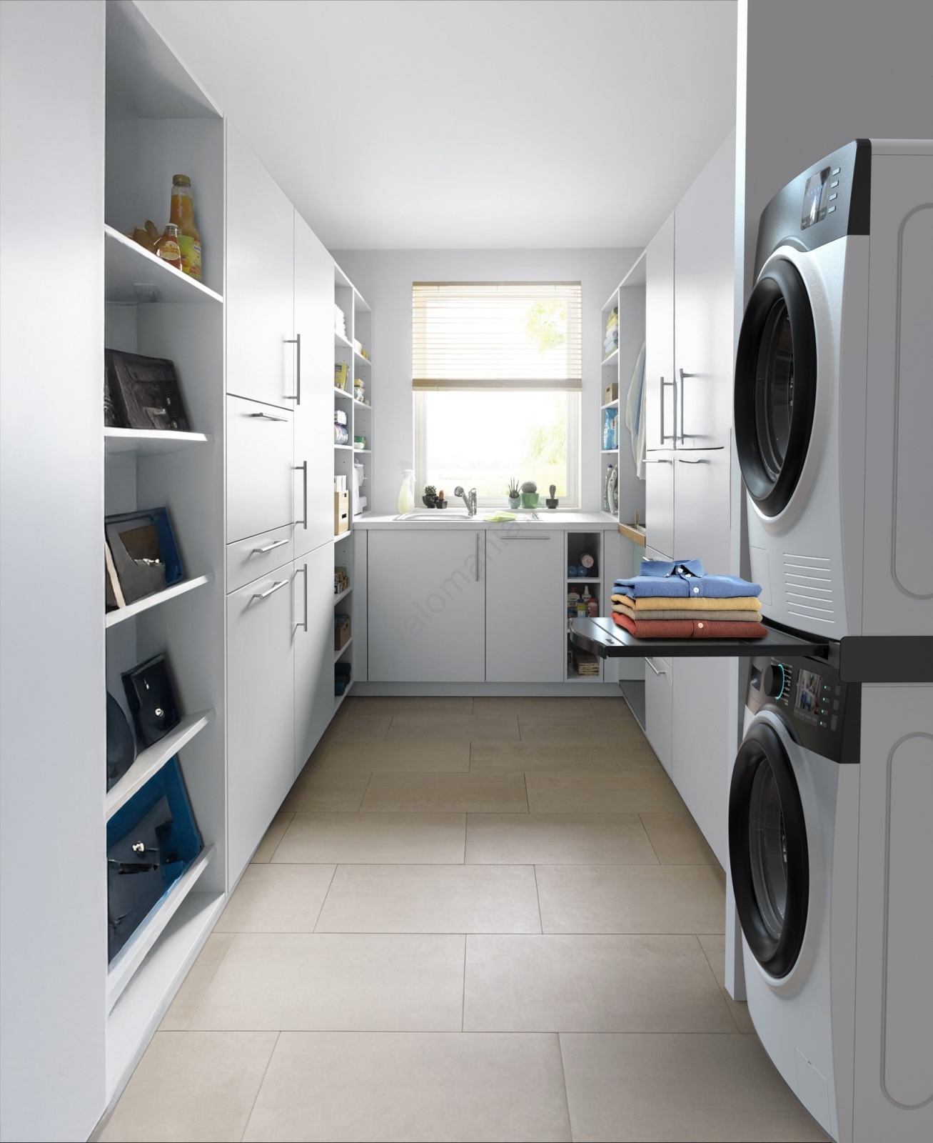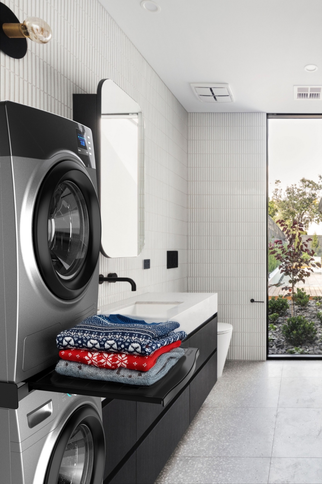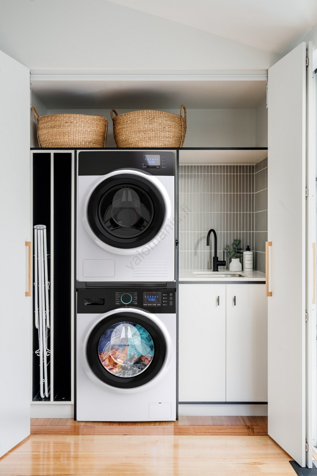 • Käytännöllinen liukuhylly 10 kg:n kantavuudella helpottamaan pyykin käsittelyä.