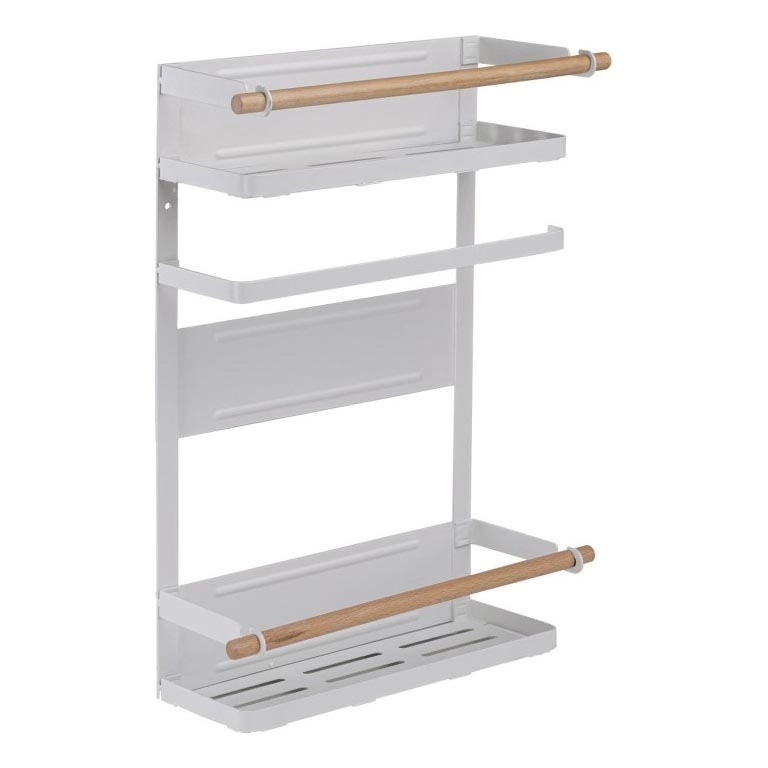 • Hylly koostuu laadukkaasta metallirakenteesta, jossa on vahvat magneetit ja reiät mahdolliseen seinäkiinnitykseen, kahdesta helposti irrotettavasta puisesta tangosta tekstiililiinojen tai kelmujen, kuten elintarvikekelmun tai foliopaperin, ripustamiseen, pituudeltaan 28 cm.