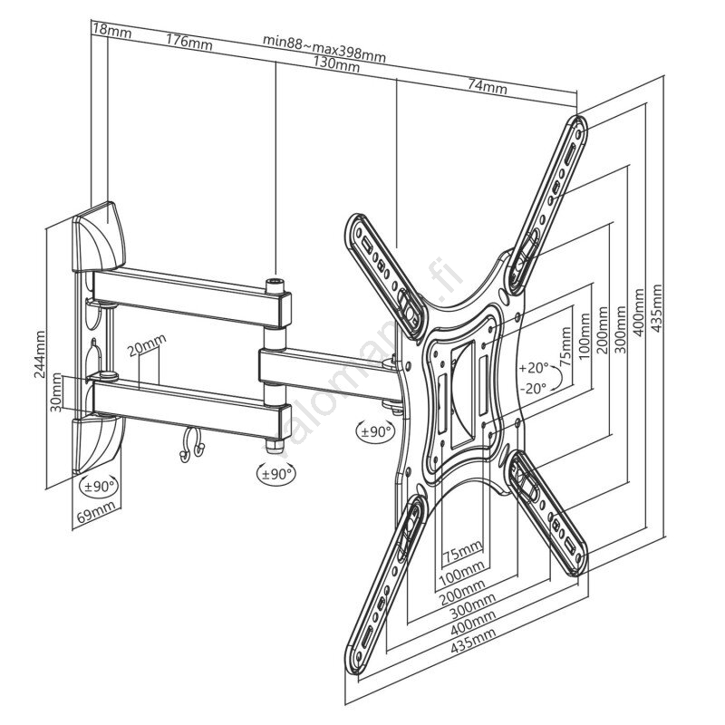• Yhteensopivat VESA-koot: 75x75, 100x100, 200x100, 200x200, 300x300, 400x200, 400x400 mm.