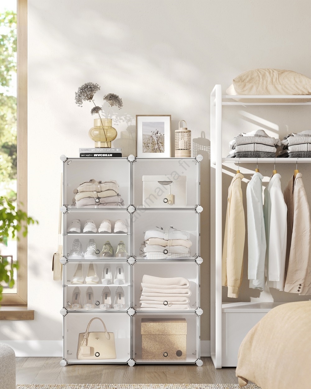 • Rakennetta voi käyttää erillisinä yksiköinä tai jopa jakaa kahdeksi pieneksi hyllyksi kenkien, vaatteiden tai kylpyhuonetarvikkeiden säilytykseen missä tahansa haluamassasi tilassa.