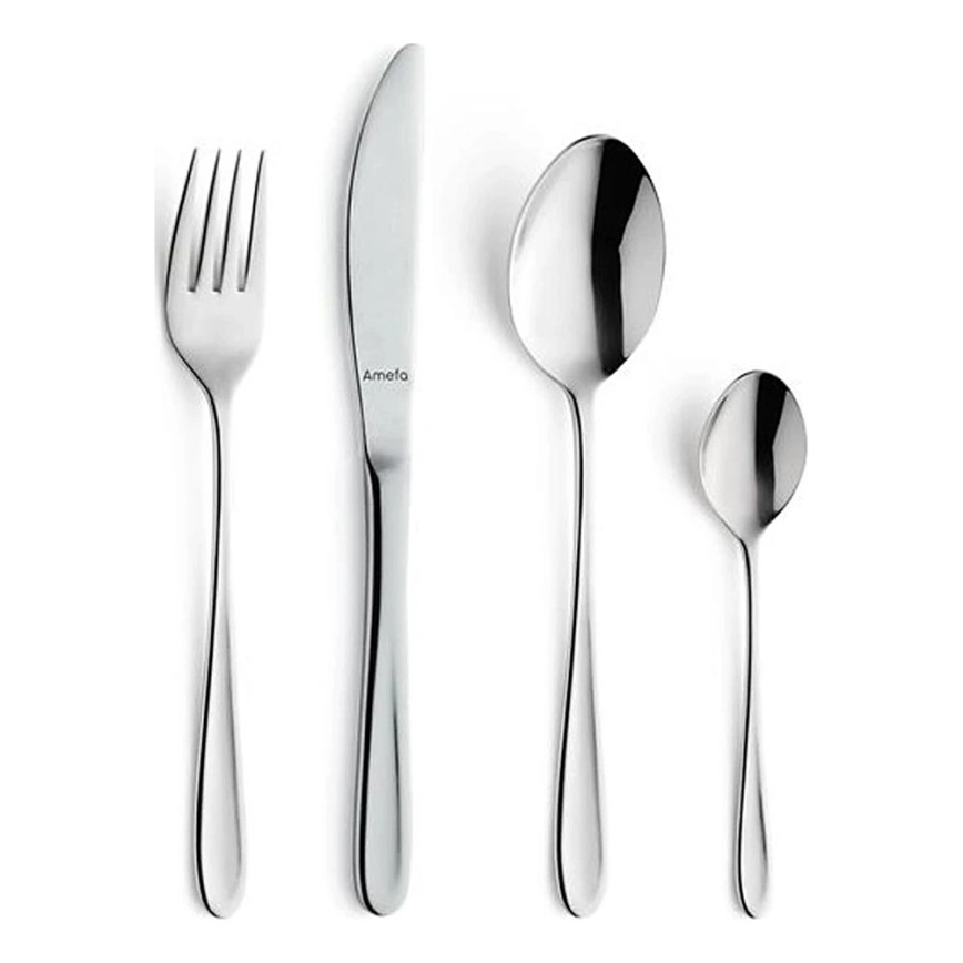 • Ruostumattomasta teräksestä valmistettu aterinsetti kiiltävässä krominvärissä.