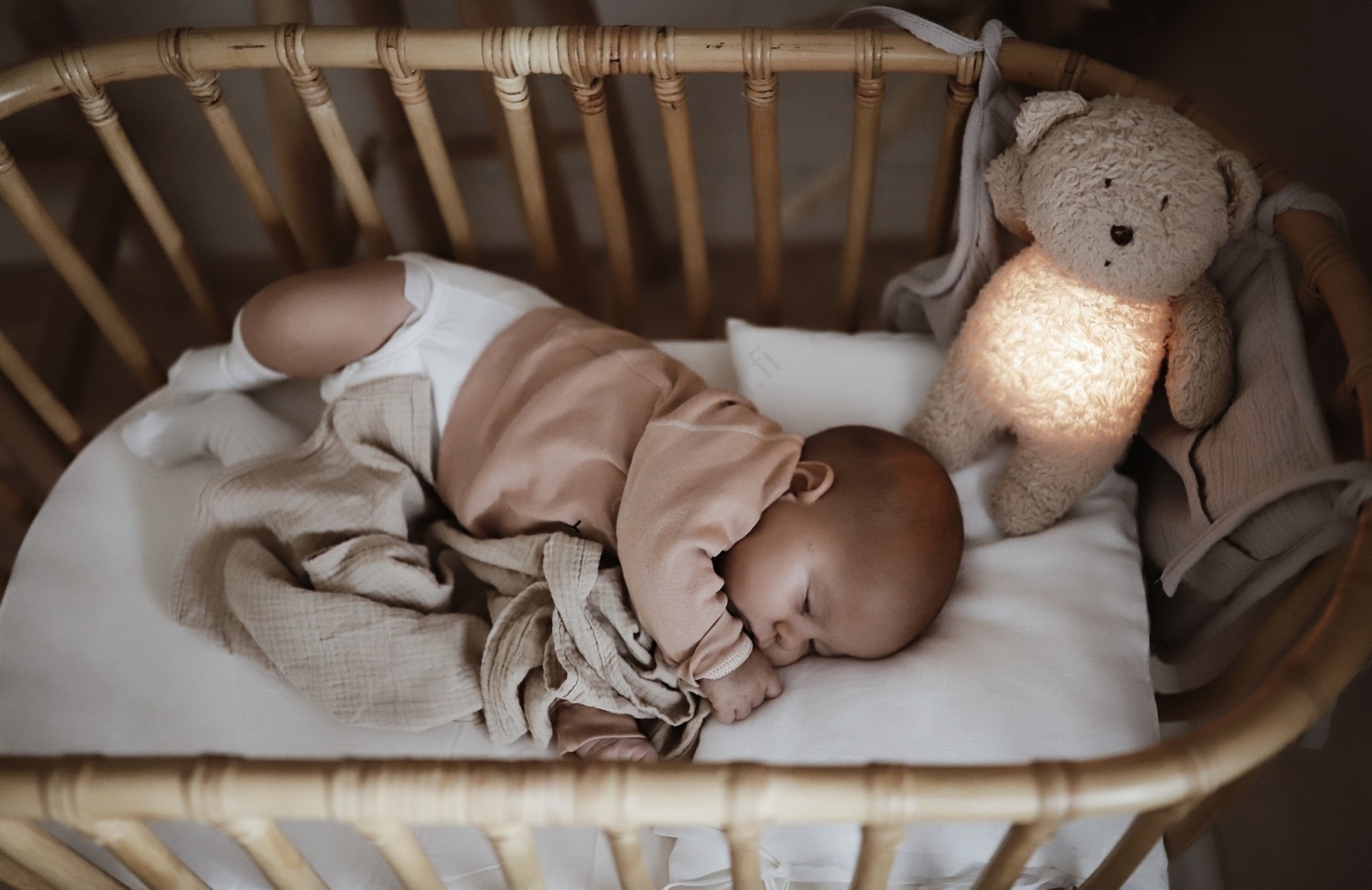 • Älykäs anturi käynnistää äänen ja valon, kun lapsi alkaa itkeä.