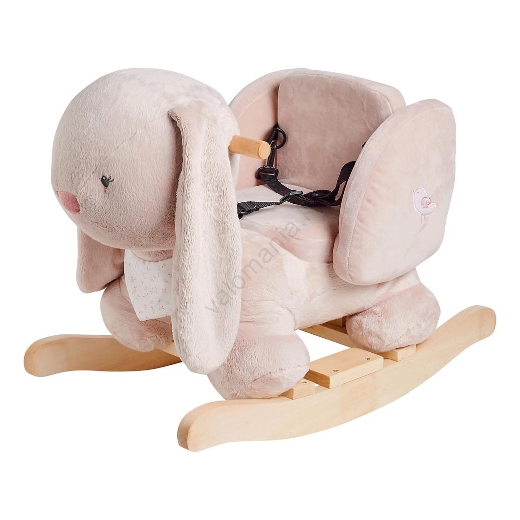 • Pehmolelu, jossa on puinen jalusta ja kahvat, houkuttelee keinumaan ja silittämään.