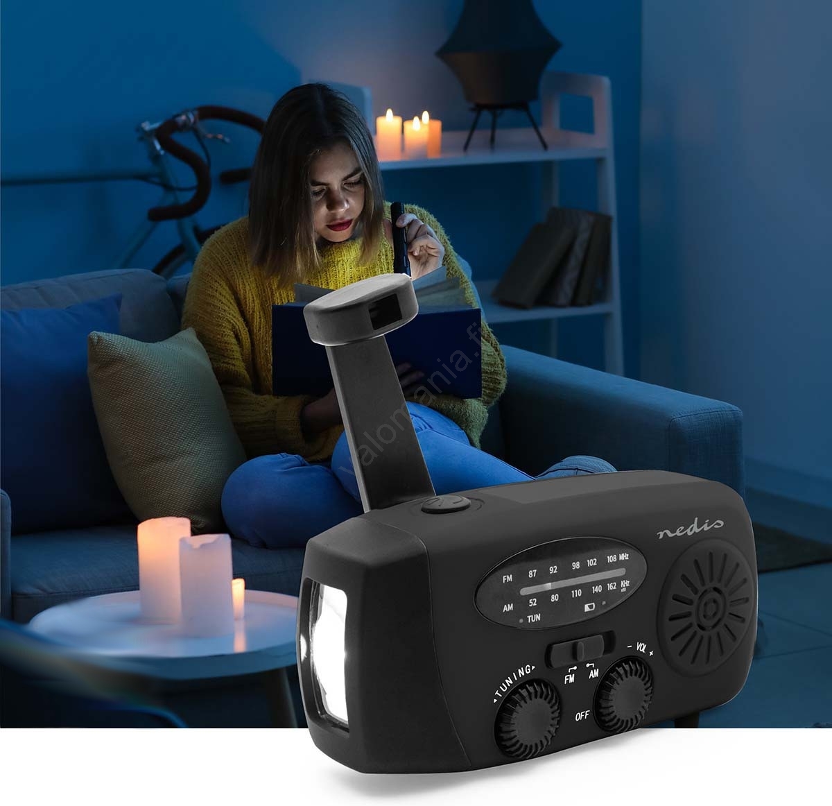 Nedis RDFMCR2000BK-AM/FM-radio käsikäyttöisellä veivillä, aurinkopaneelilla ja 2000 mAh:n LED-taskul